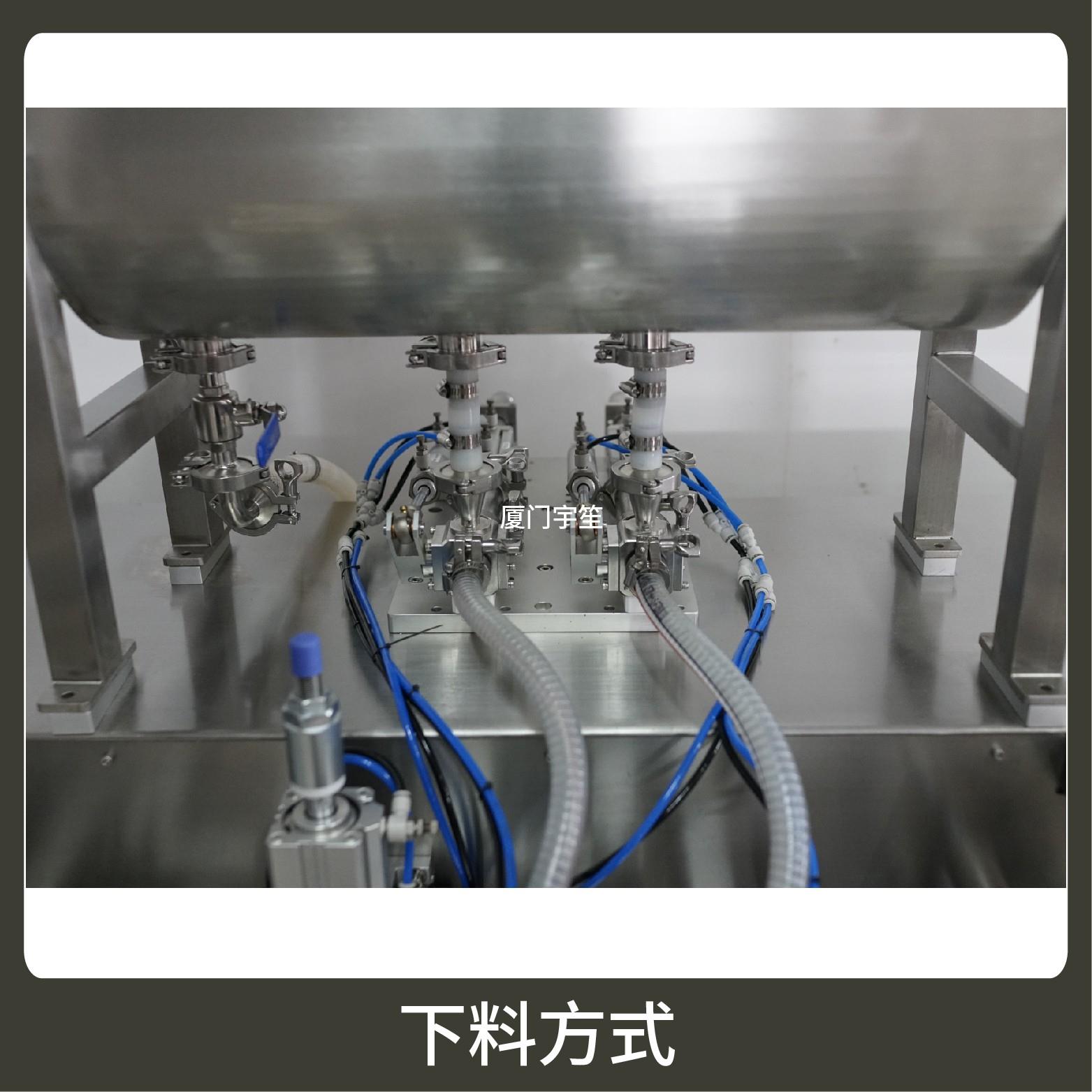2、成品雙出,包裝流程全自動,無需人工操作。可根據充填物料的性質選配不同的下料結構。